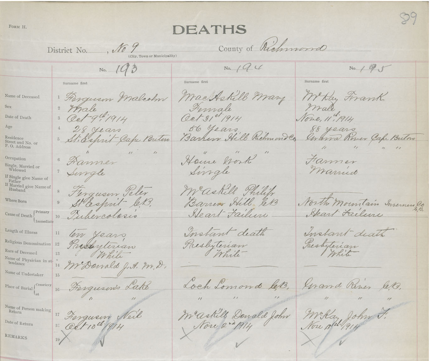 Male Death Registration: Year: 1914 book: 47 page: 89 number: 193