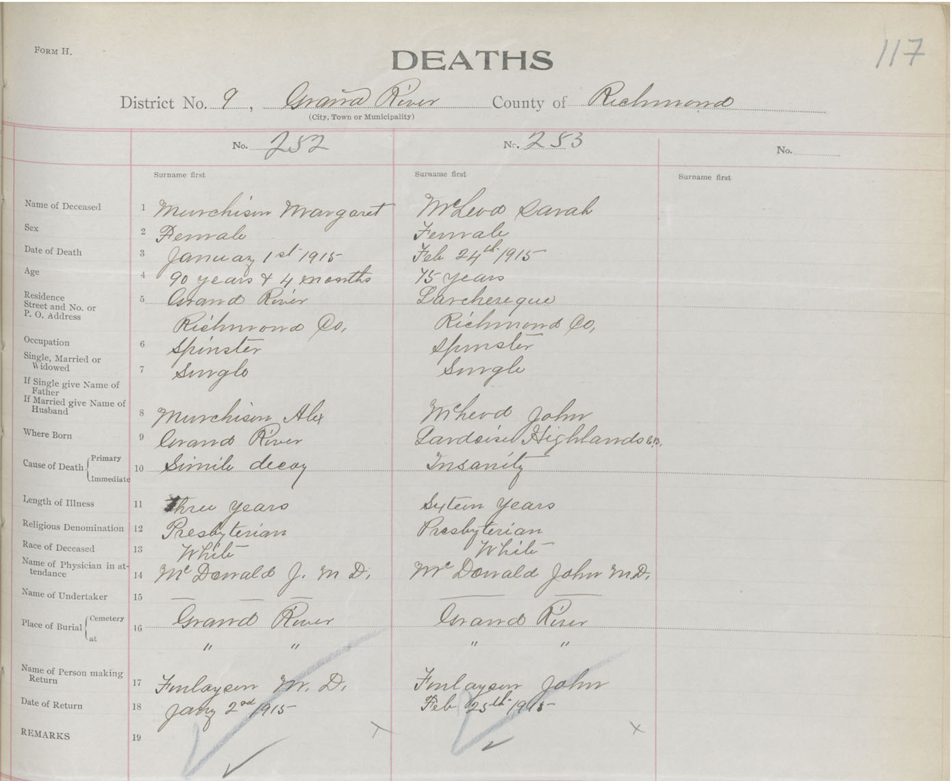 Female Death Registration: Year: 1915 book: 47 page: 117 number: 253