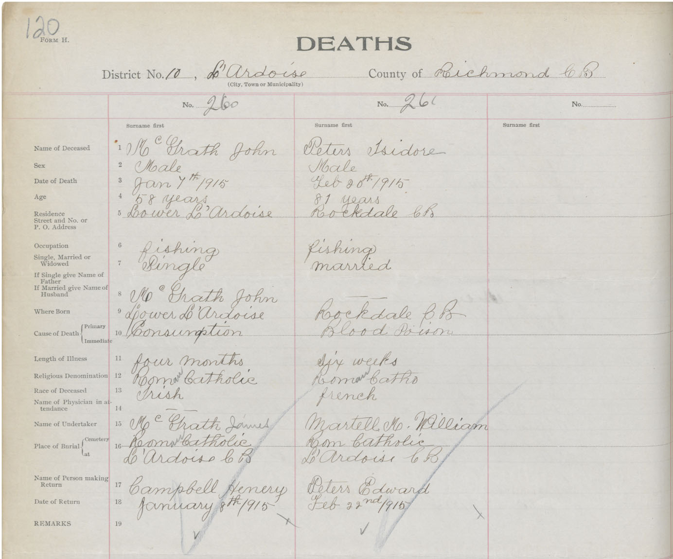 Male Death Registration: Year: 1915 book: 47 page: 120 number: 261