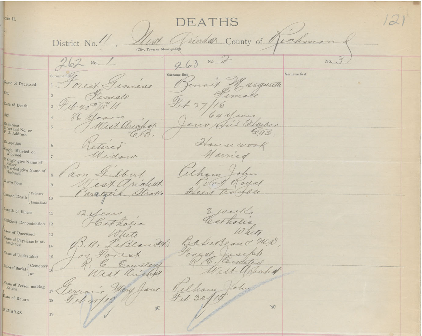 Female Death Registration: Year: 1915 book: 47 page: 121 number: 263