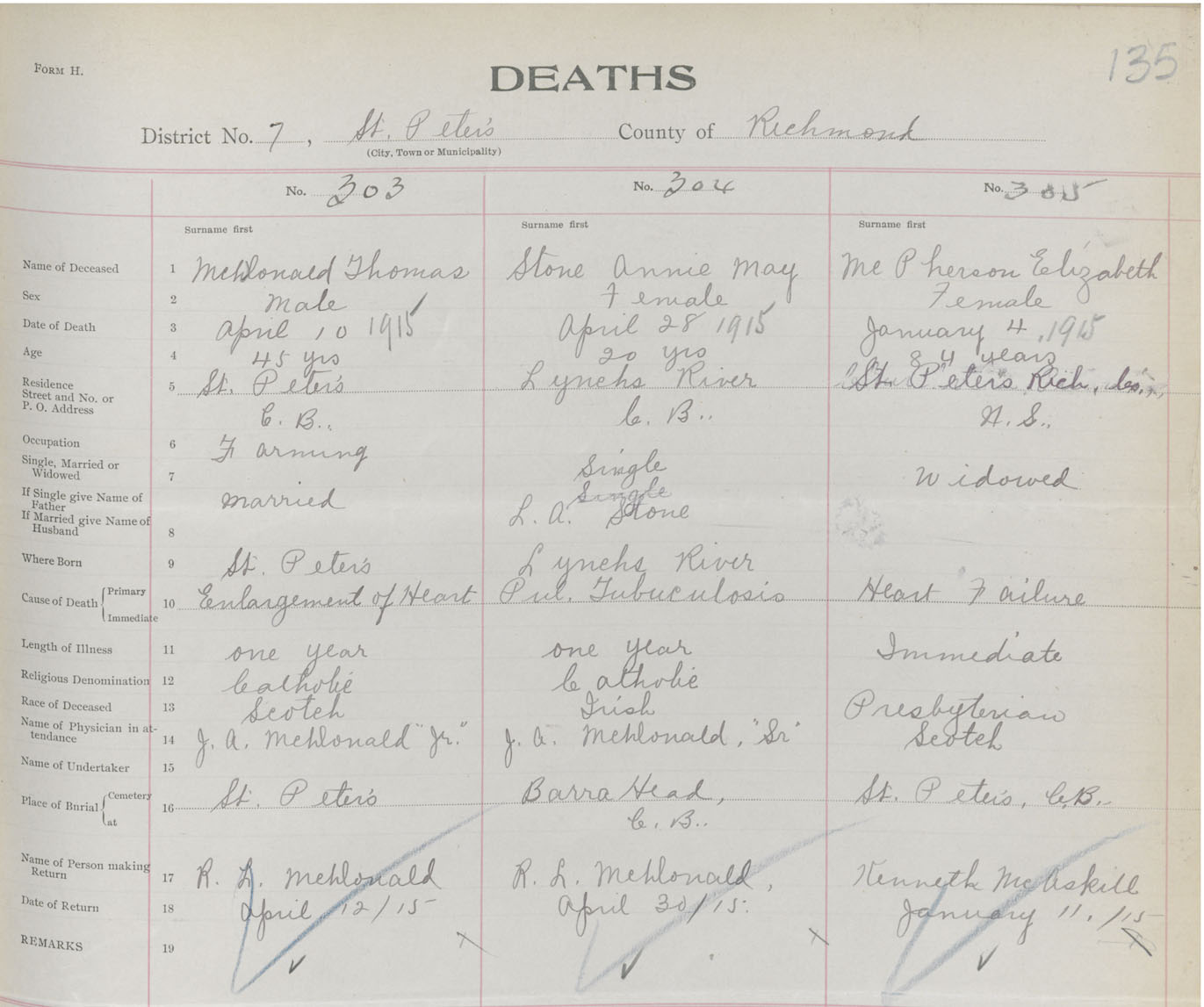 Female Death Registration: Year: 1915 book: 47 page: 135 number: 305