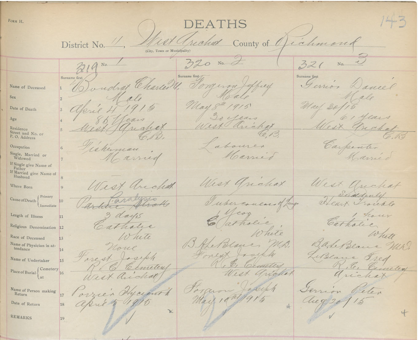 Male Death Registration: Year: 1915 book: 47 page: 143 number: 319