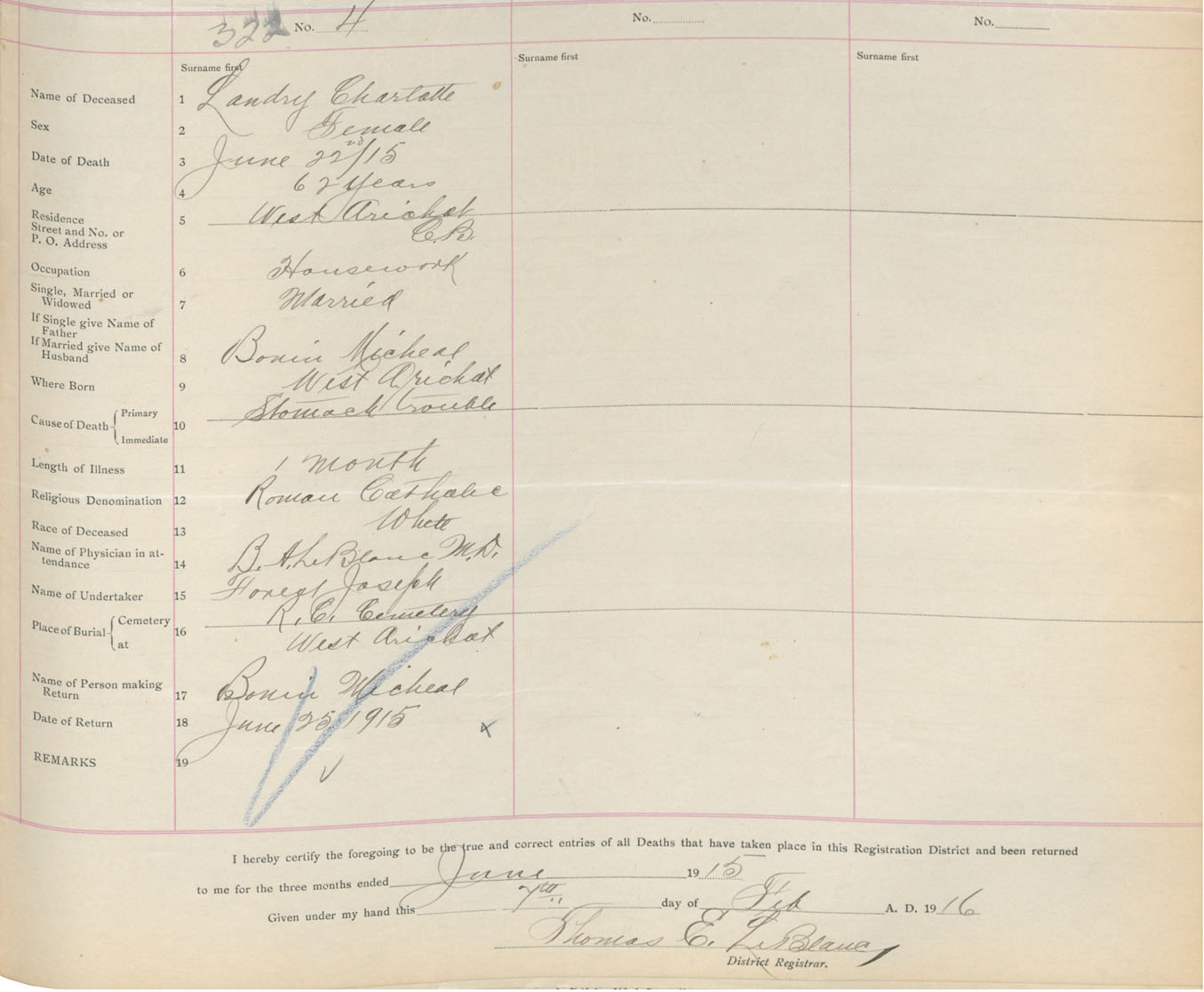 Female Death Registration: Year: 1915 book: 47 page: 143 number: 322