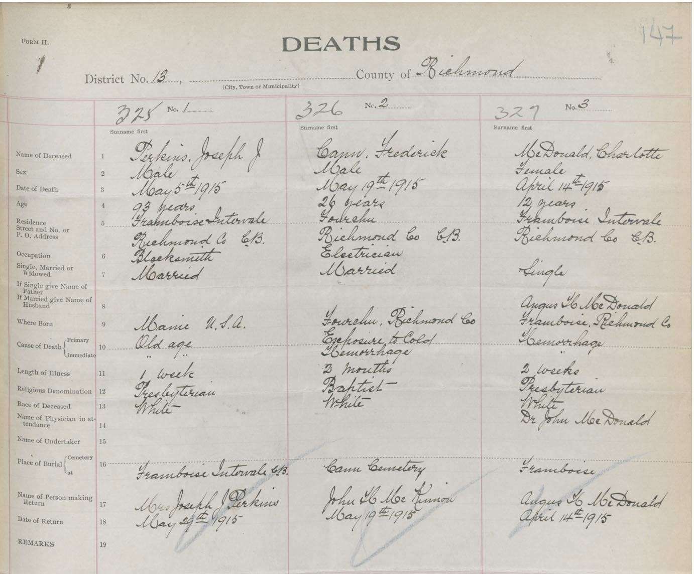 Male Death Registration: Year: 1915 book: 47 page: 147 number: 325