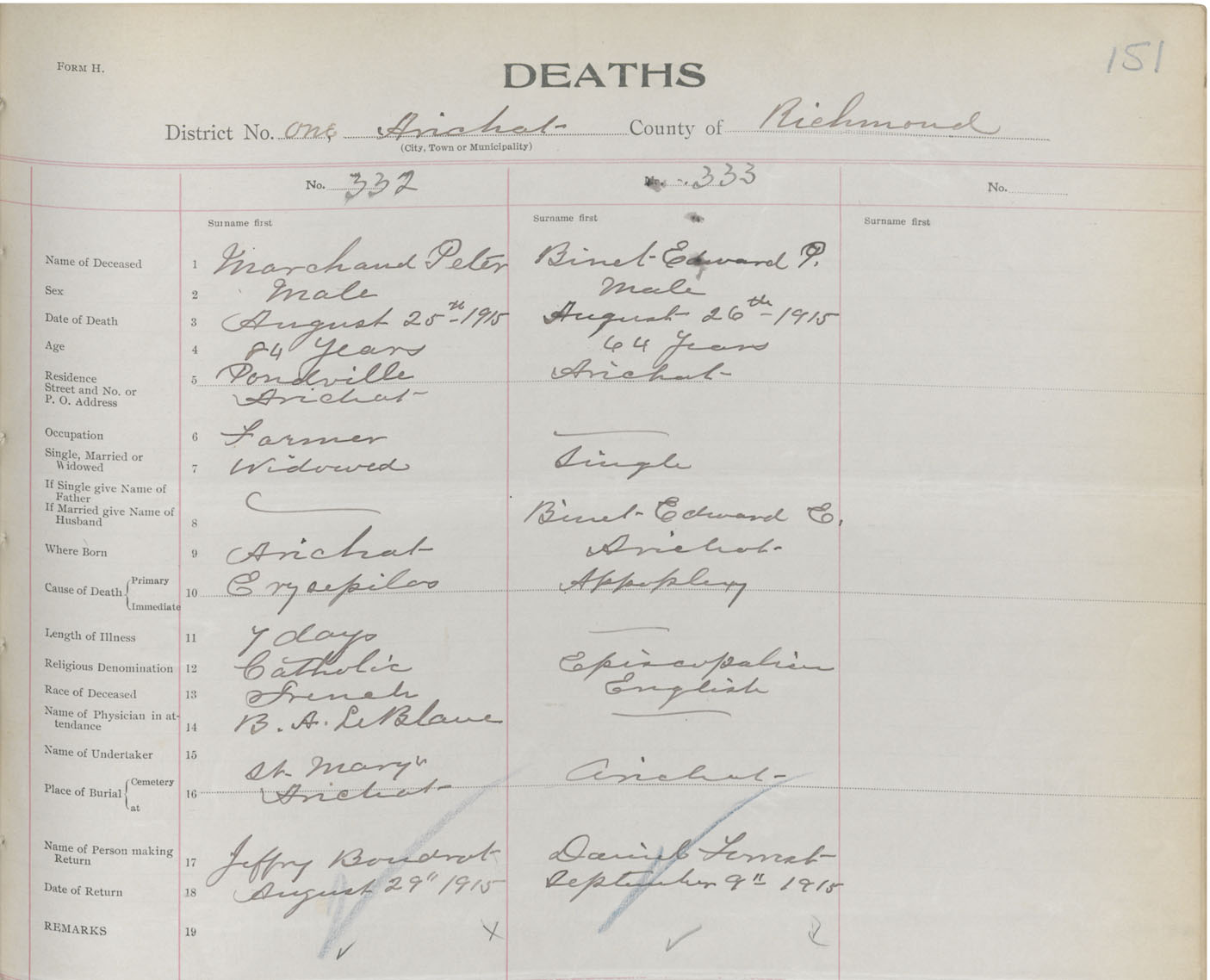 Male Death Registration: Year: 1915 book: 47 page: 151 number: 333
