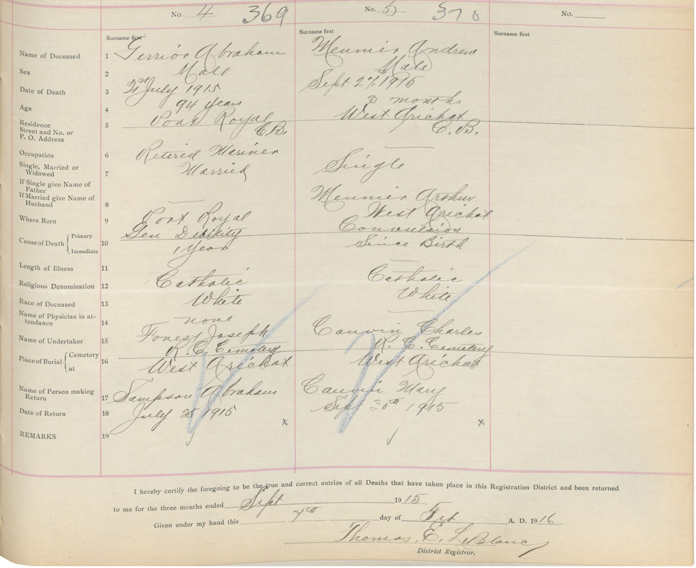 Male Death Registration: Year: 1915 book: 47 page: 167 number: 369