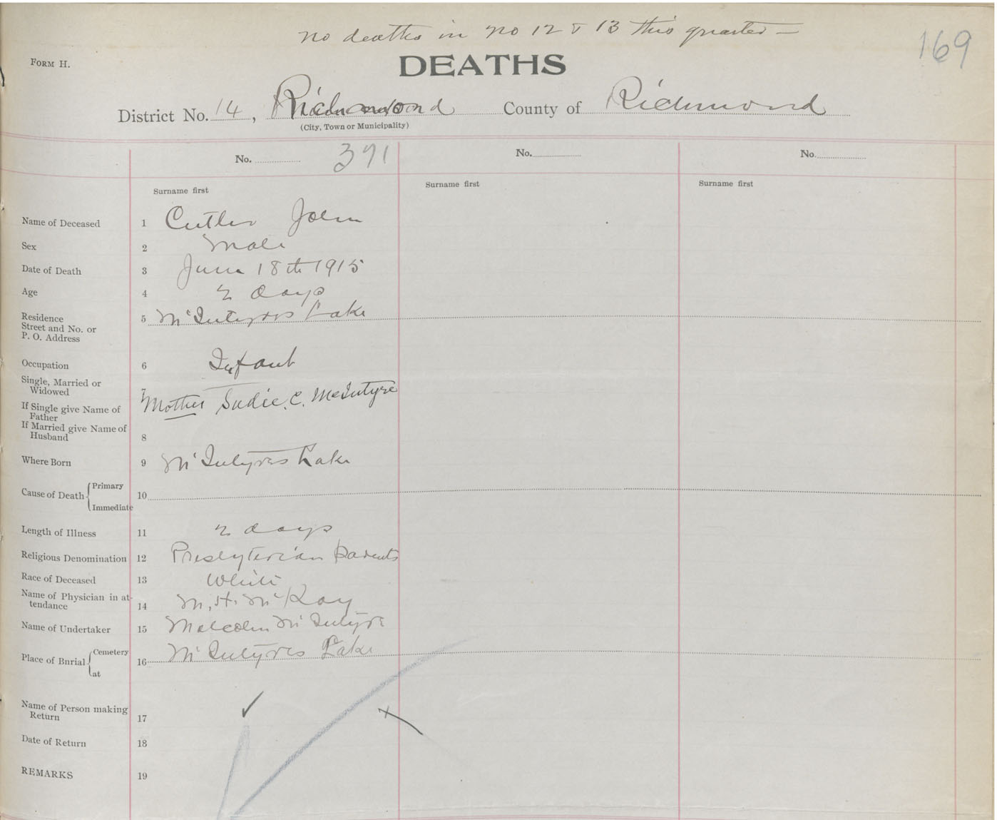 Male Death Registration: Year: 1915 book: 47 page: 169 number: 371