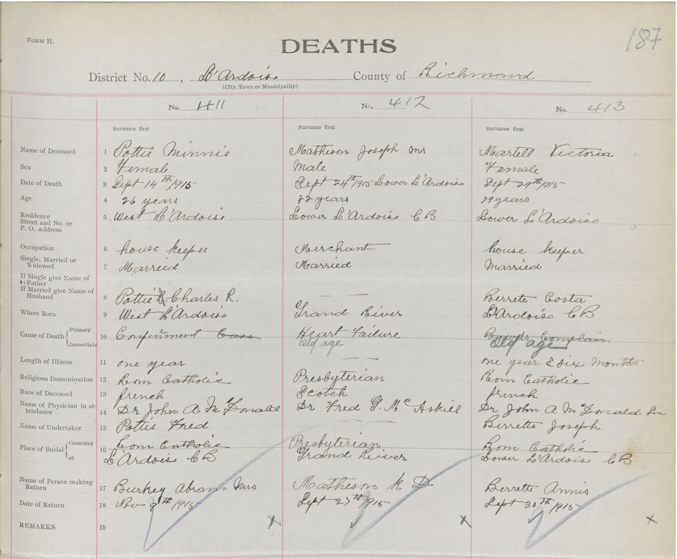 Female Death Registration: Year: 1915 book: 47 page: 187 number: 411