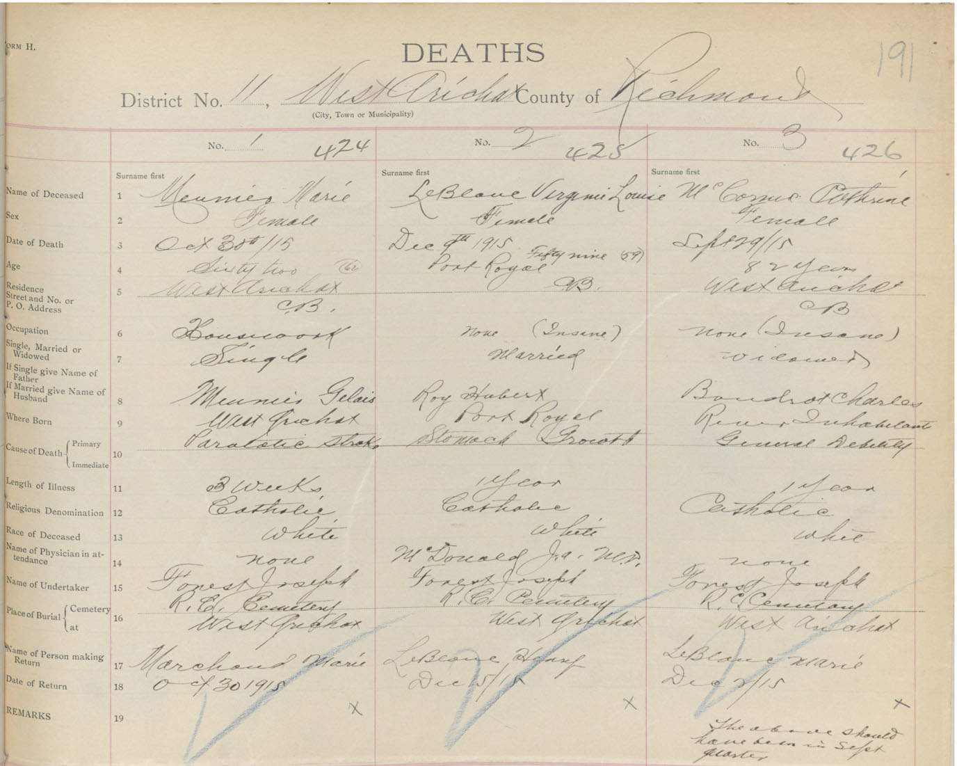 Female Death Registration: Year: 1915 book: 47 page: 191 number: 426