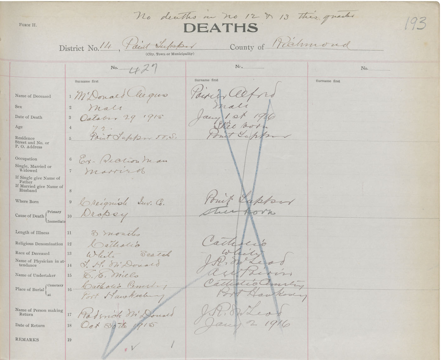 Male Death Registration: Year: 1915 book: 47 page: 193 number: 427