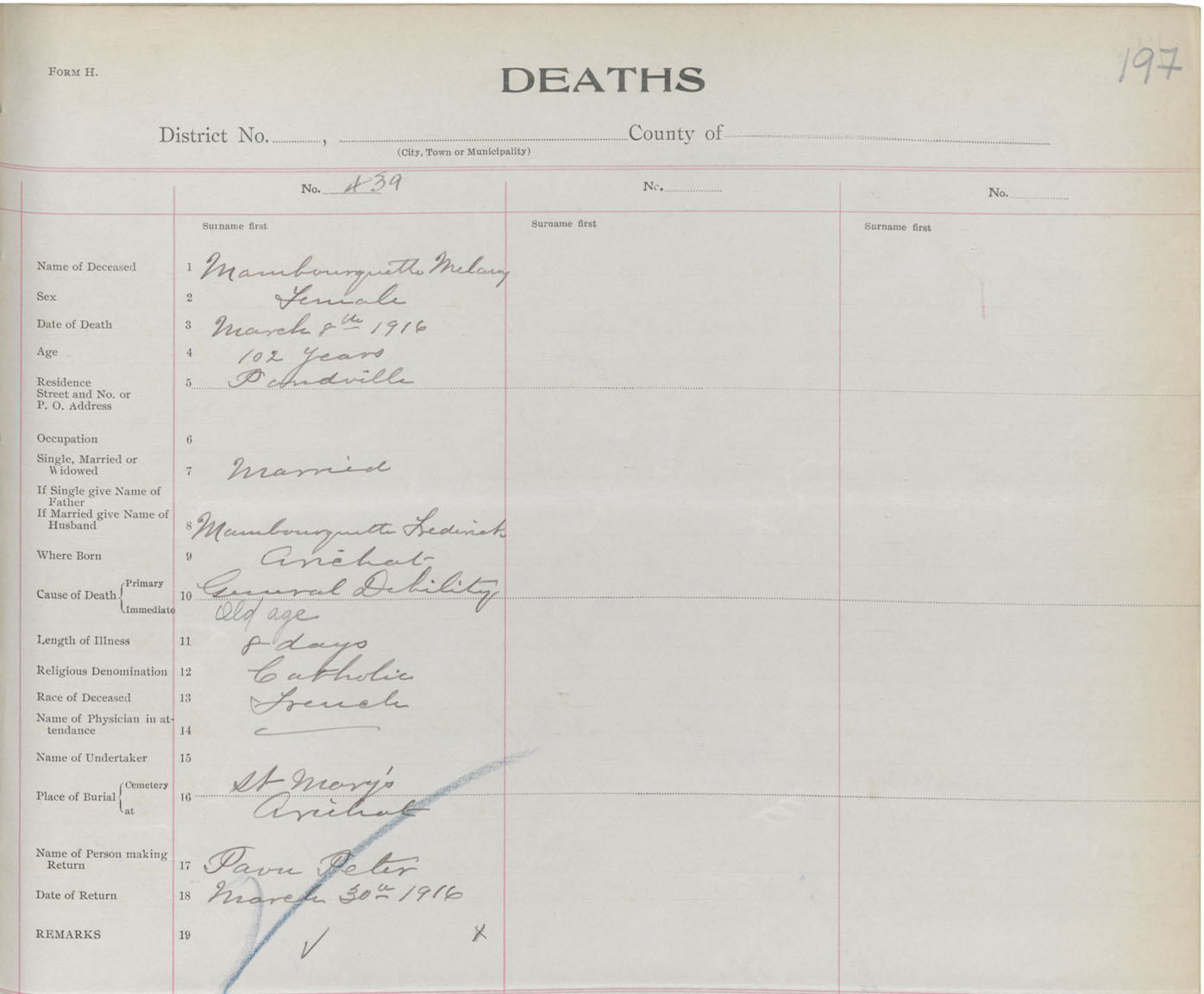 Female Death Registration: Year: 1916 book: 47 page: 197 number: 439