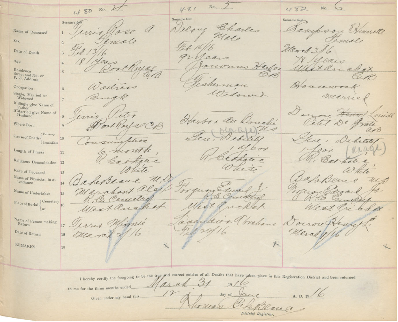 Female Death Registration: Year: 1916 book: 47 page: 215 number: 482