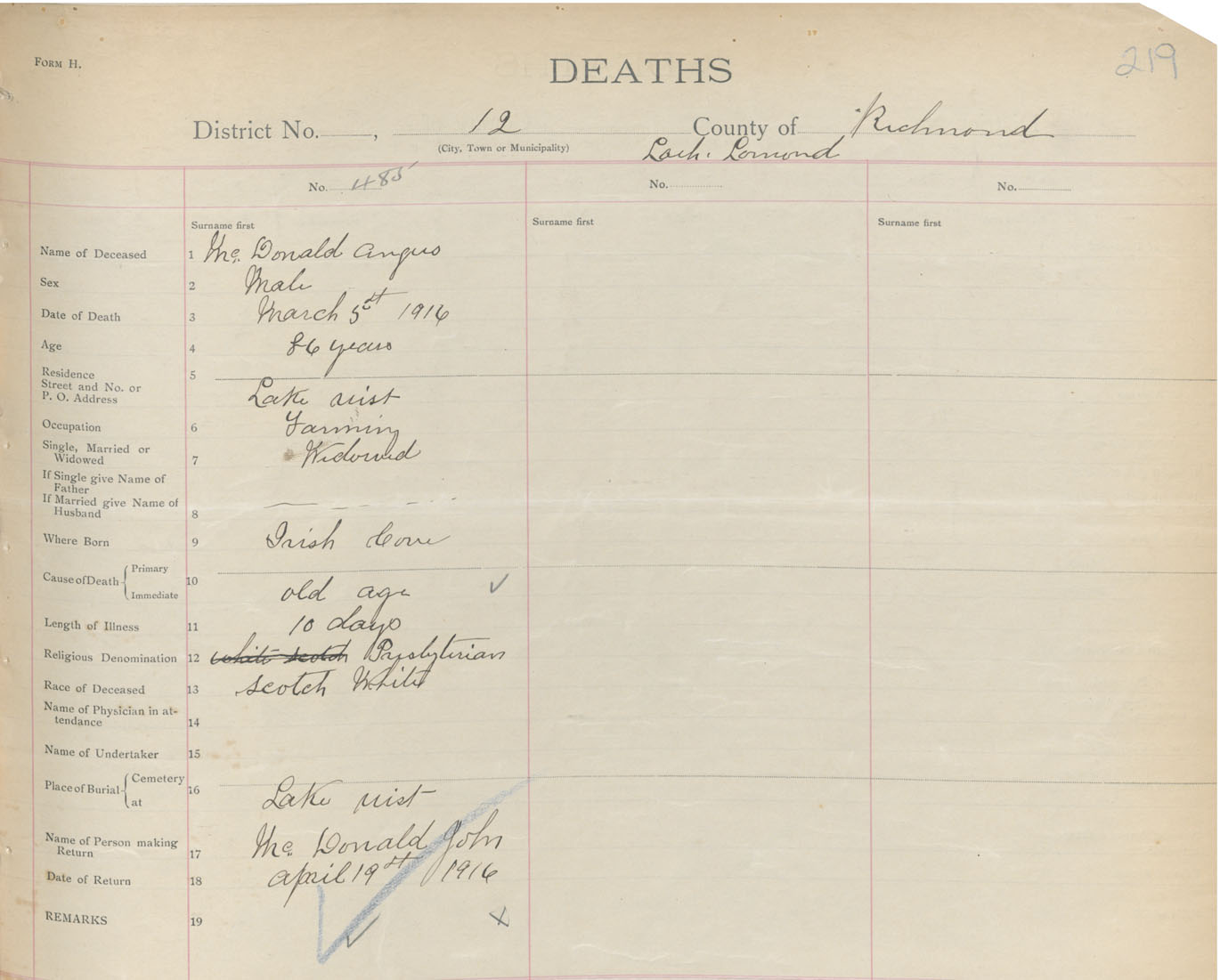 Male Death Registration: Year: 1916 book: 47 page: 219 number: 485