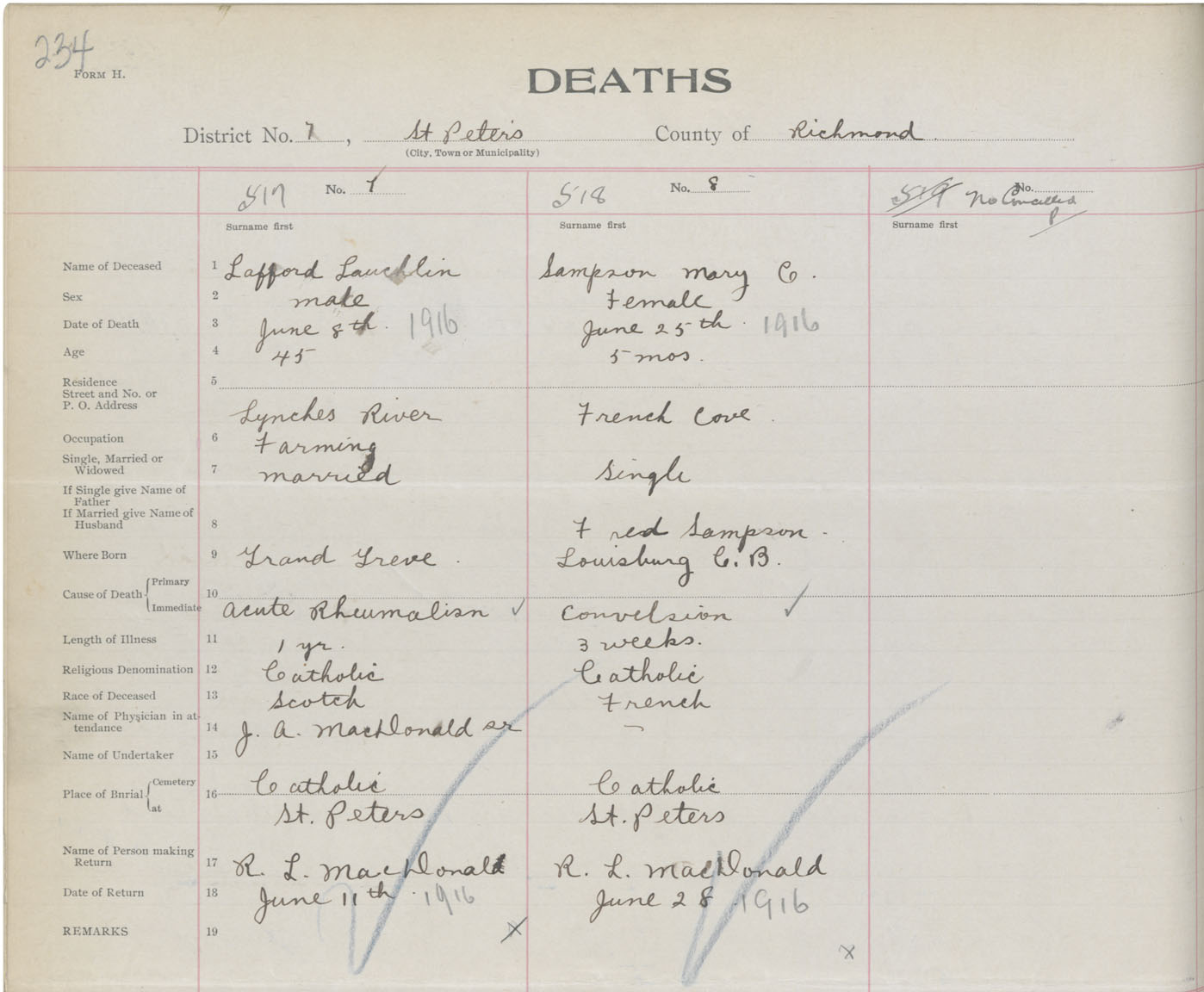 Male Death Registration: Year: 1916 book: 47 page: 234 number: 517