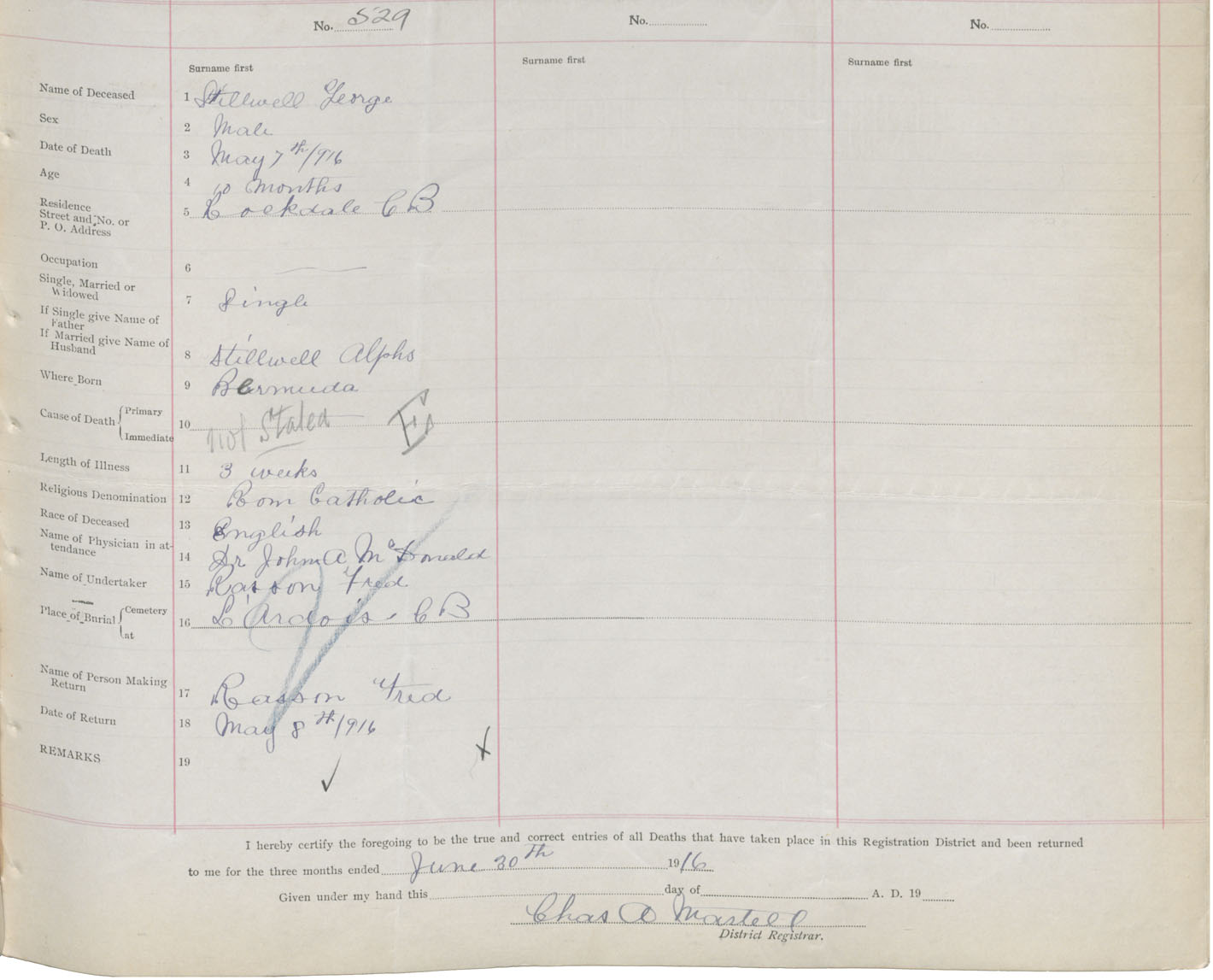 Male Death Registration: Year: 1916 book: 47 page: 239 number: 529