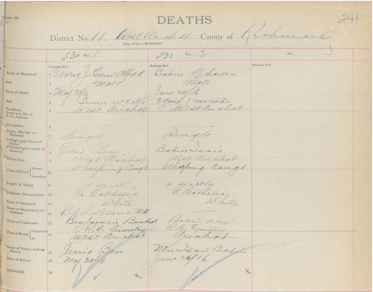 Male Death Registration: Year: 1916 book: 47 page: 241 number: 530