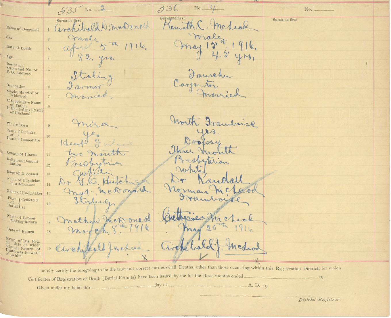 Male Death Registration: Year: 1916 book: 47 page: 243 number: 535