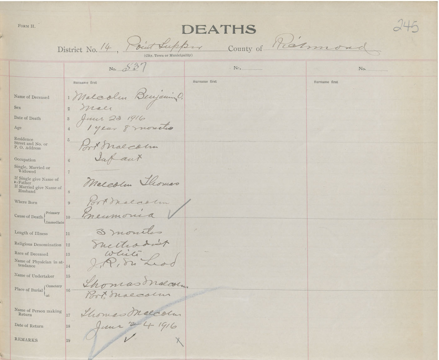 Male Death Registration: Year: 1916 book: 47 page: 245 number: 537