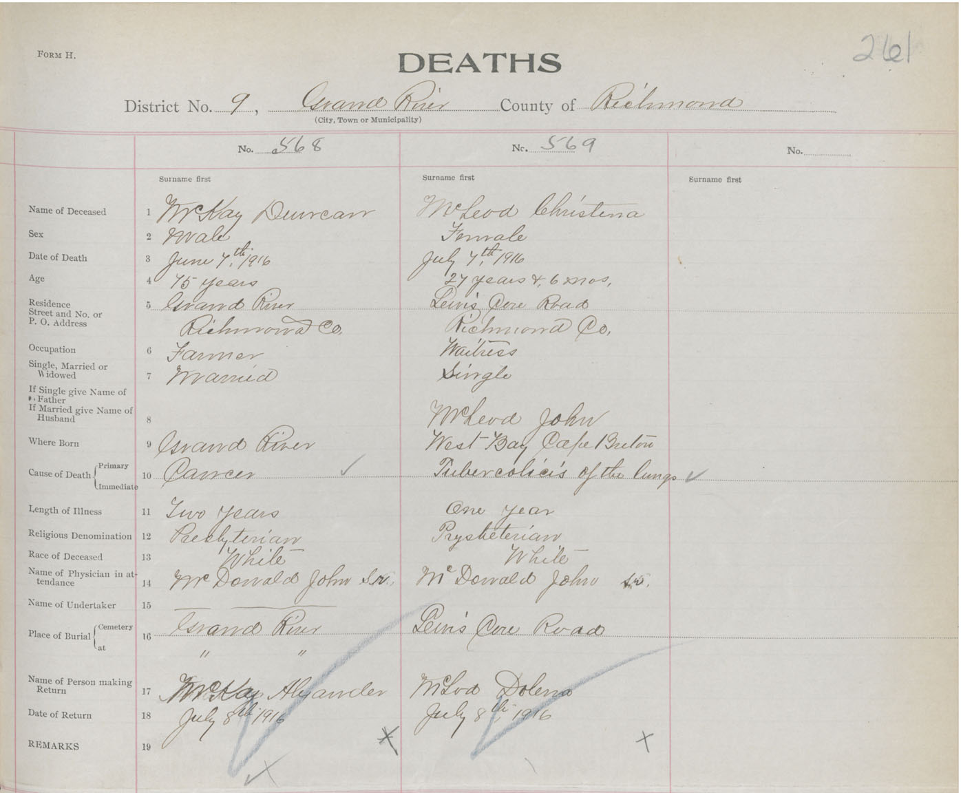 Male Death Registration: Year: 1916 book: 47 page: 261 number: 568