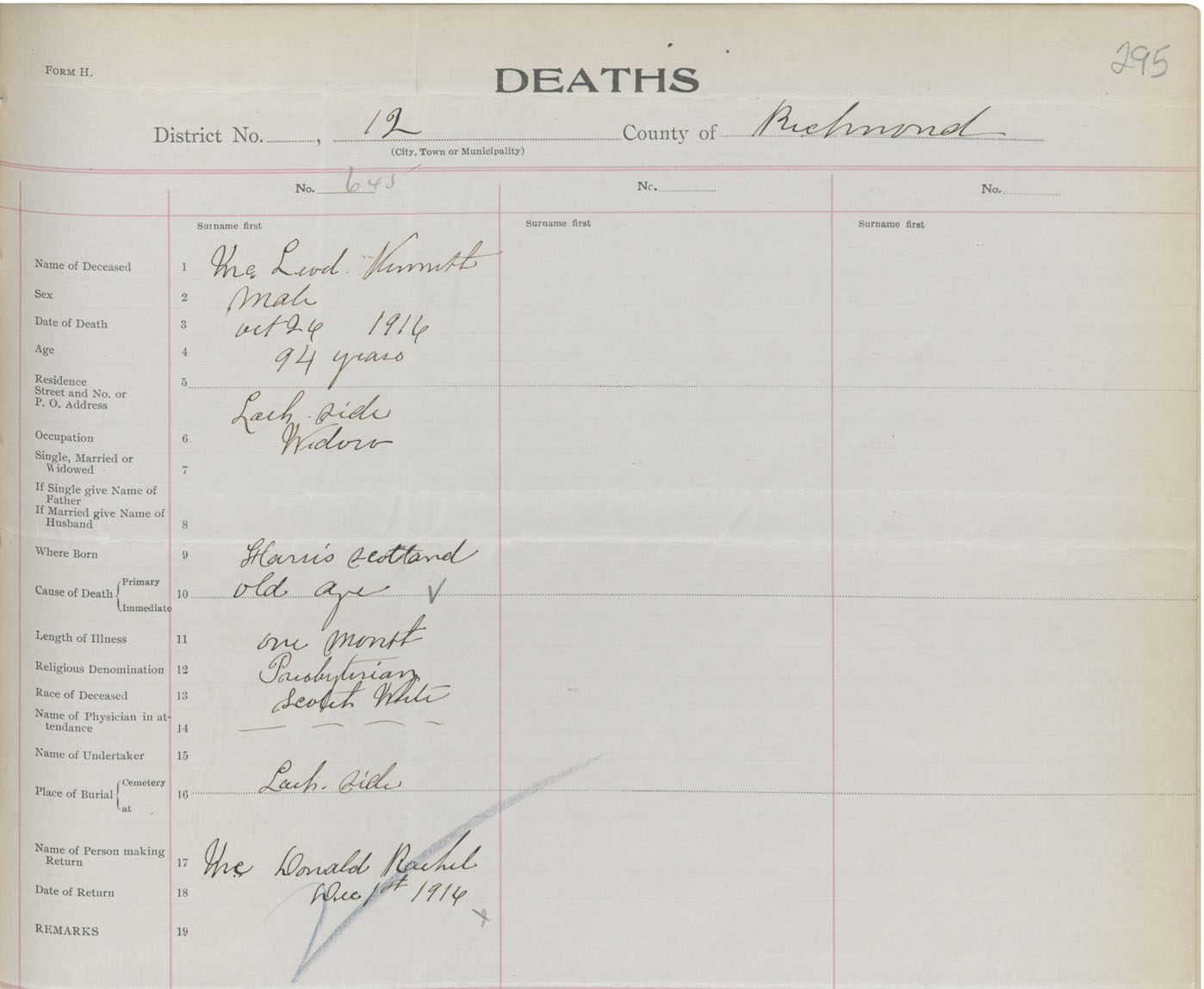 Male Death Registration: Year: 1916 book: 47 page: 295 number: 645