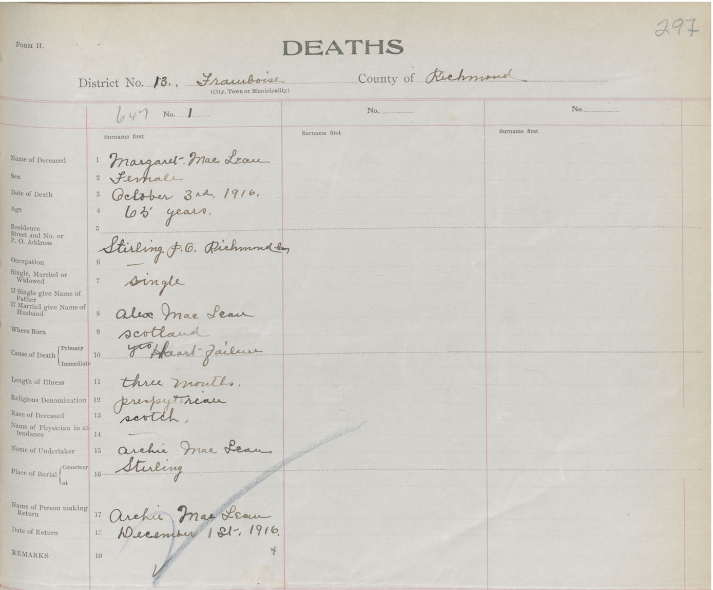 Female Death Registration: Year: 1916 book: 47 page: 297 number: 647