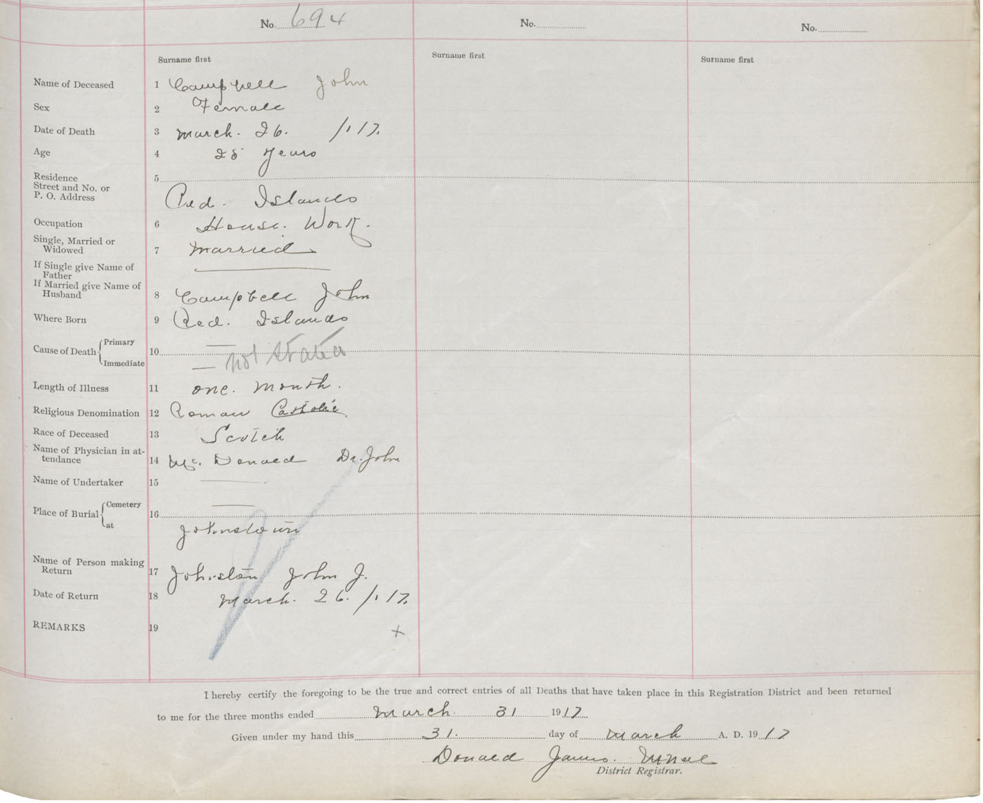 Female Death Registration: Year: 1917 book: 47 page: 317 number: 694