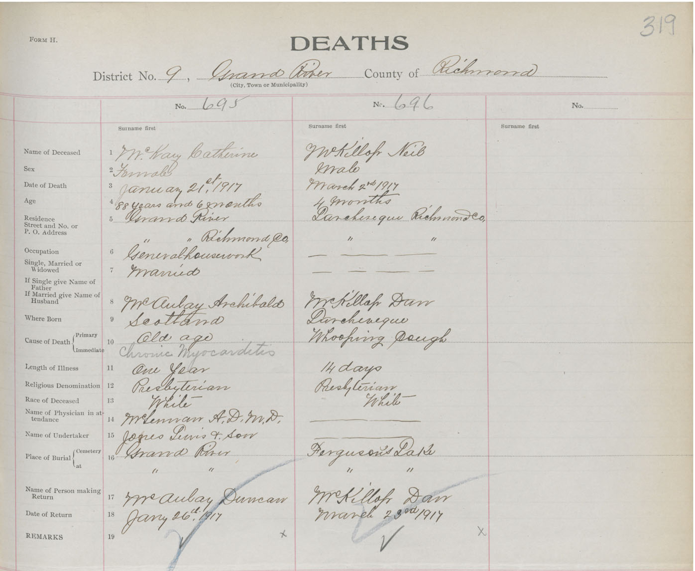 Female Death Registration: Year: 1917 book: 47 page: 319 number: 695