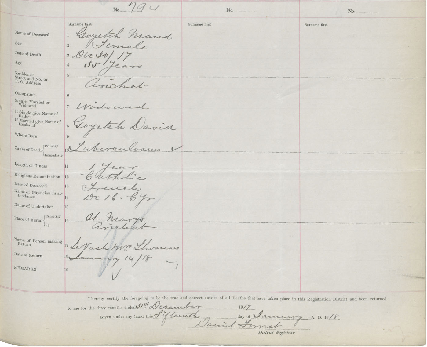 Female Death Registration: Year: 1917 book: 47 page: 373 number: 794