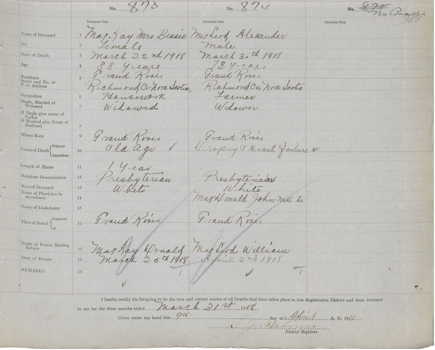 Male Death Registration: Year: 1918 book: 47 page: 409 number: 874