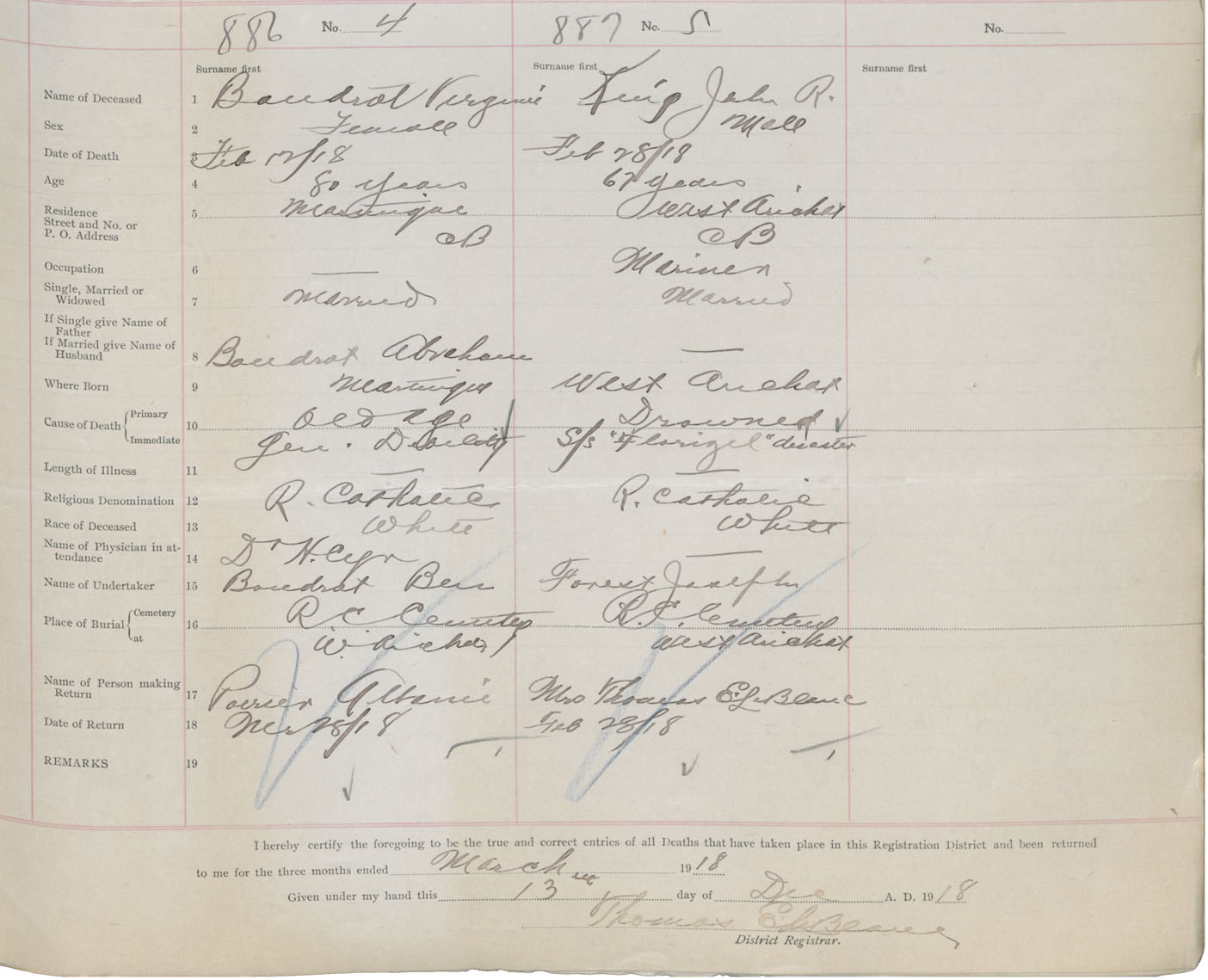 Male Death Registration: Year: 1918 book: 47 page: 413 number: 887