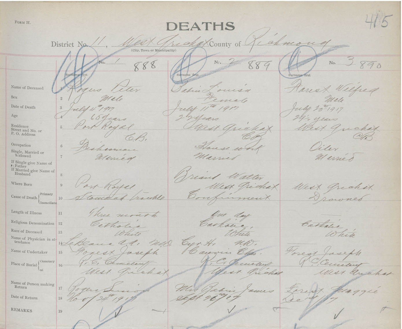 Male Death Registration: Year: 1917 book: 47 page: 415 number: 890