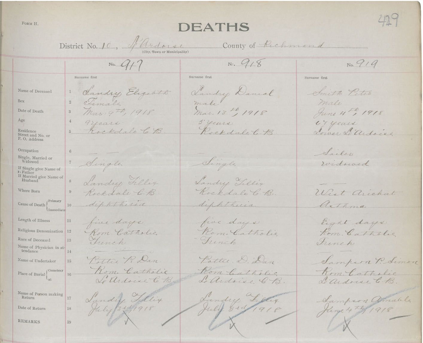 Male Death Registration: Year: 1918 book: 47 page: 429 number: 919