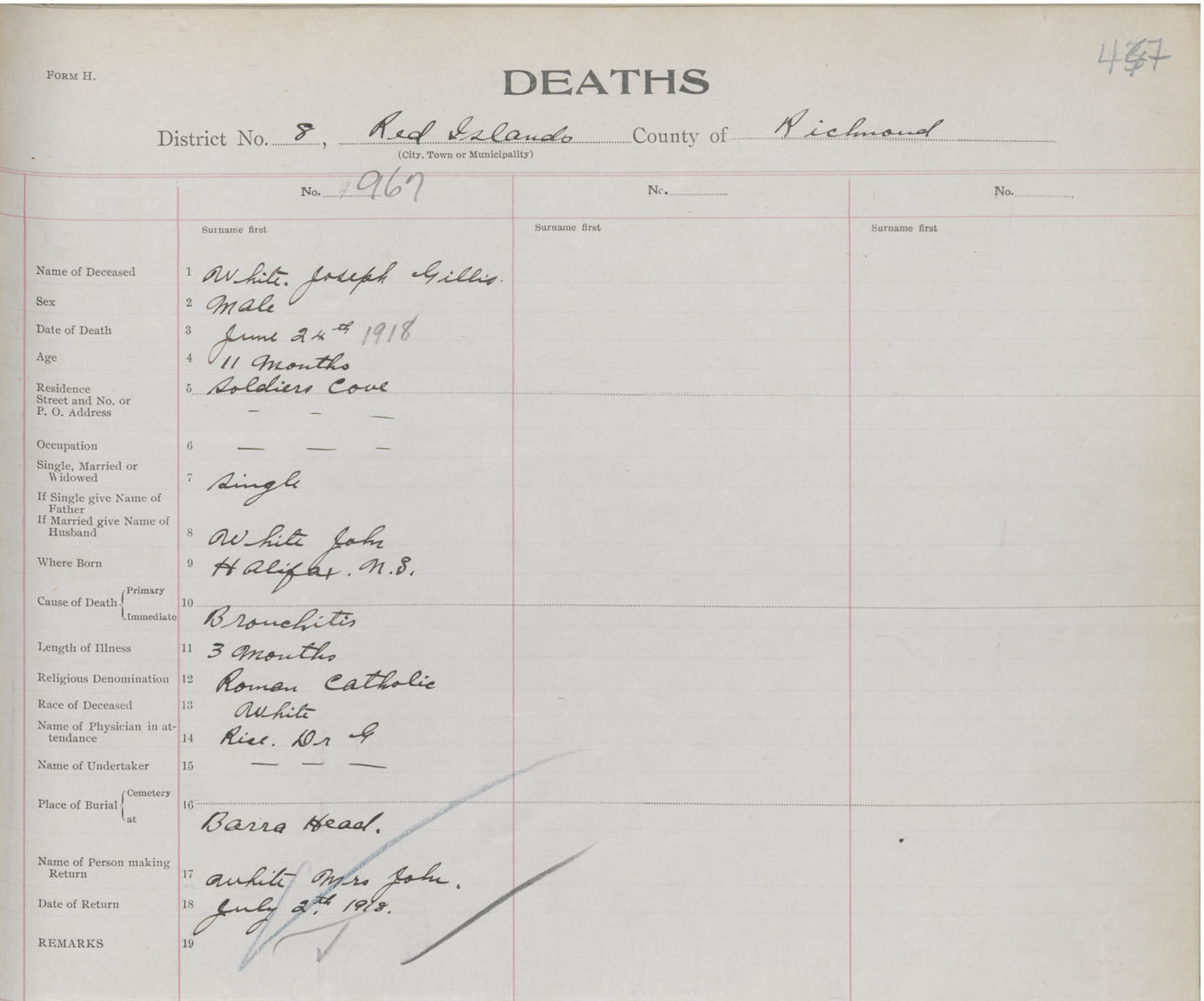 Male Death Registration: Year: 1918 book: 47 page: 447 number: 967
