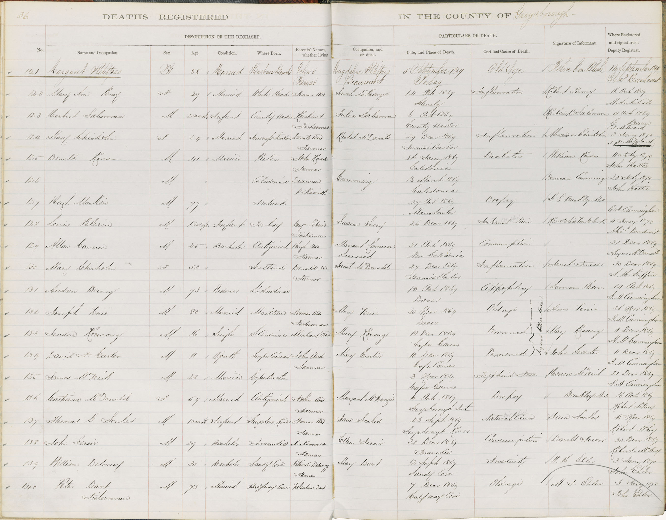 Death Registration: Year: 1869 book: 1807 page: 36 number: 140