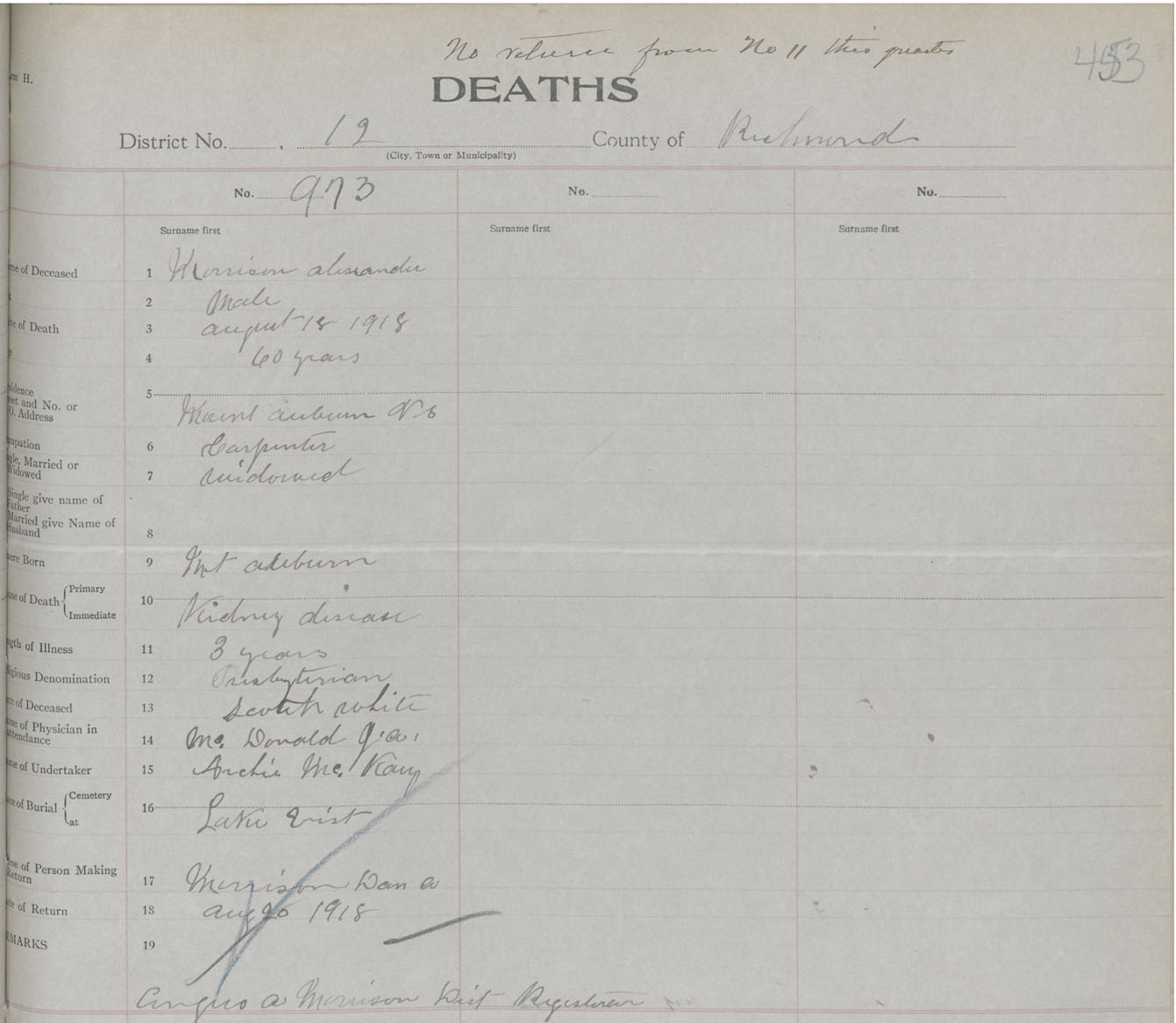 Male Death Registration: Year: 1918 book: 47 page: 453 number: 973