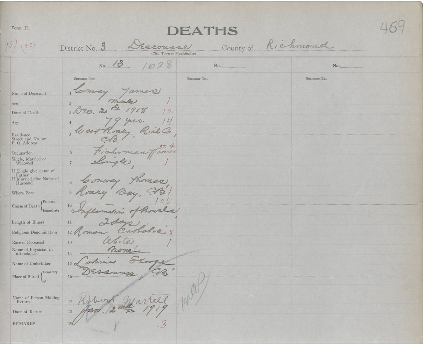 Male Death Registration: Year: 1918 book: 47 page: 469 number: 1028