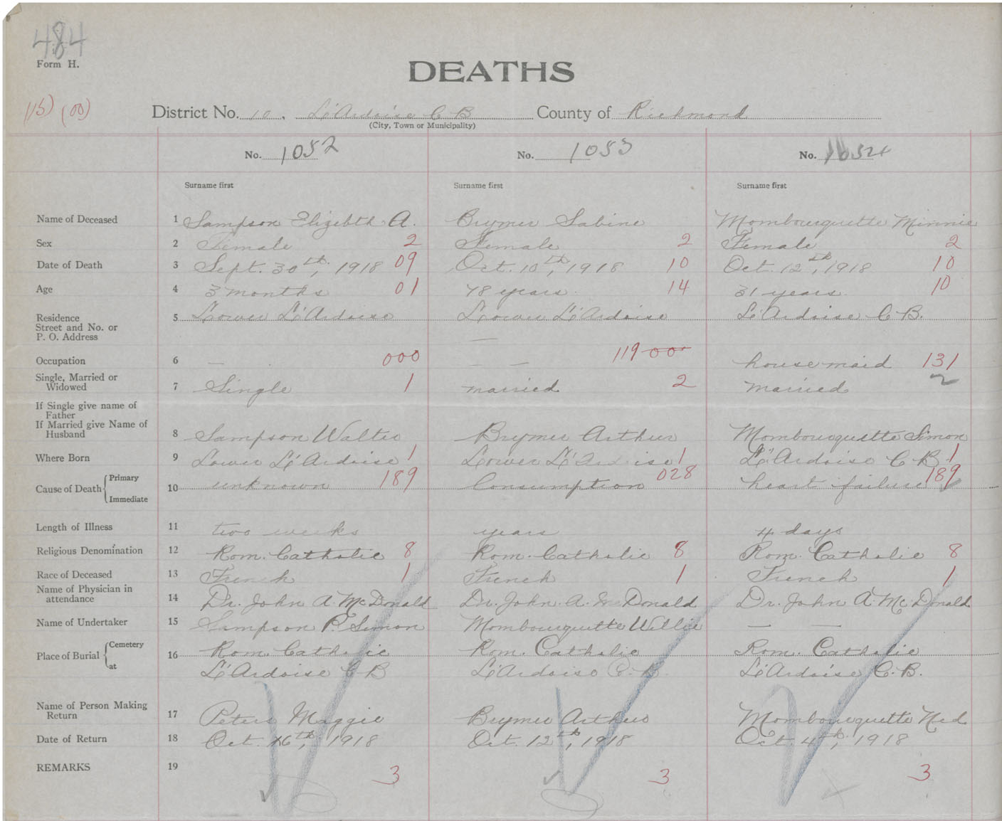 Female Death Registration: Year: 1918 book: 47 page: 484 number: 1052