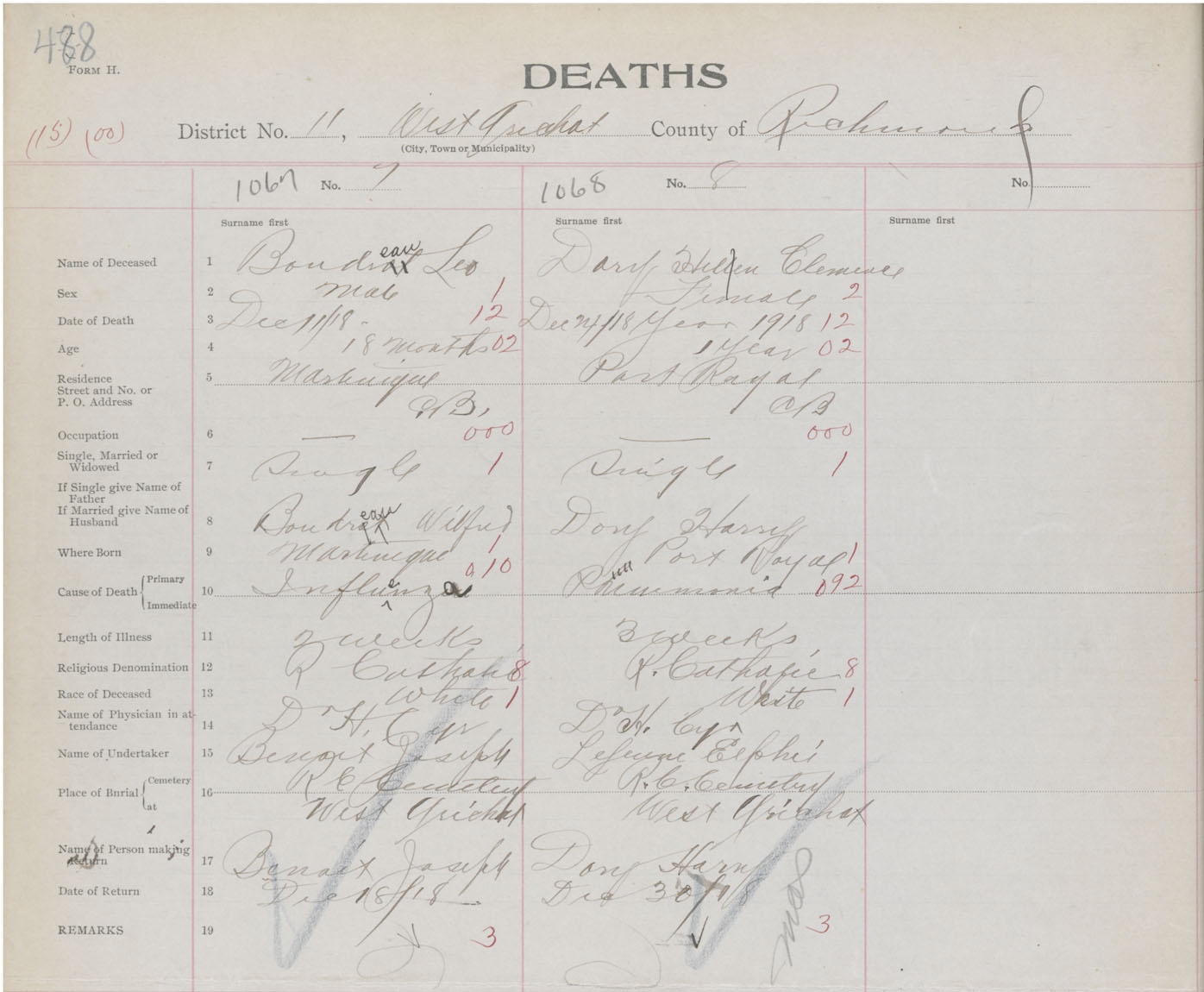 Male Death Registration: Year: 1918 book: 47 page: 488 number: 1067