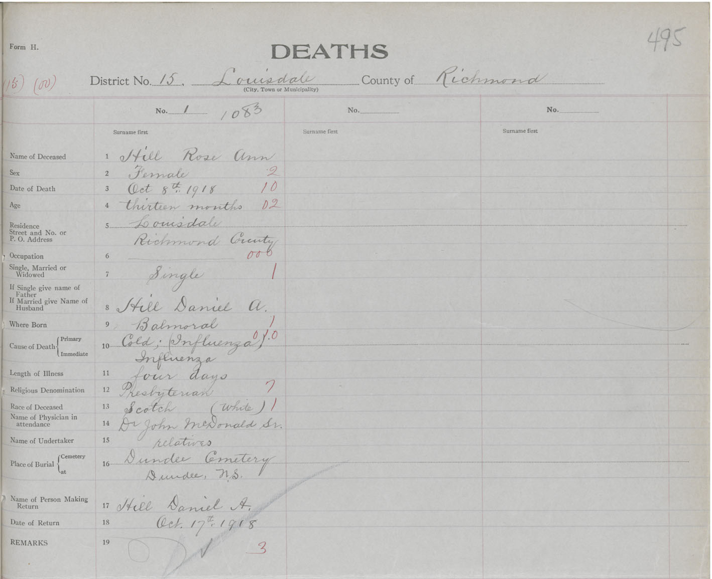 Female Death Registration: Year: 1918 book: 47 page: 495 number: 1083