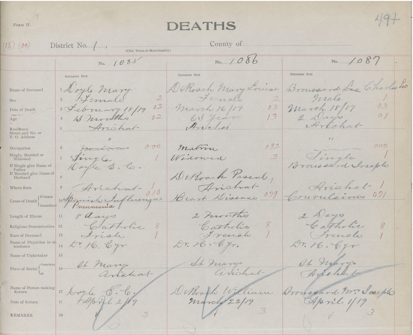 Female Death Registration: Year: 1919 book: 47 page: 497 number: 1085