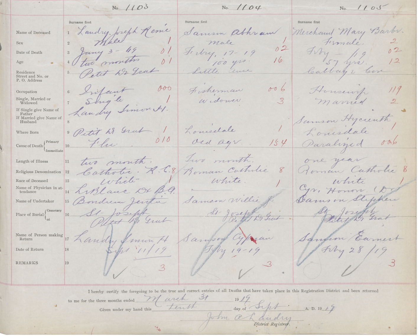 Male Death Registration: Year: 1919 book: 47 page: 501 number: 1103