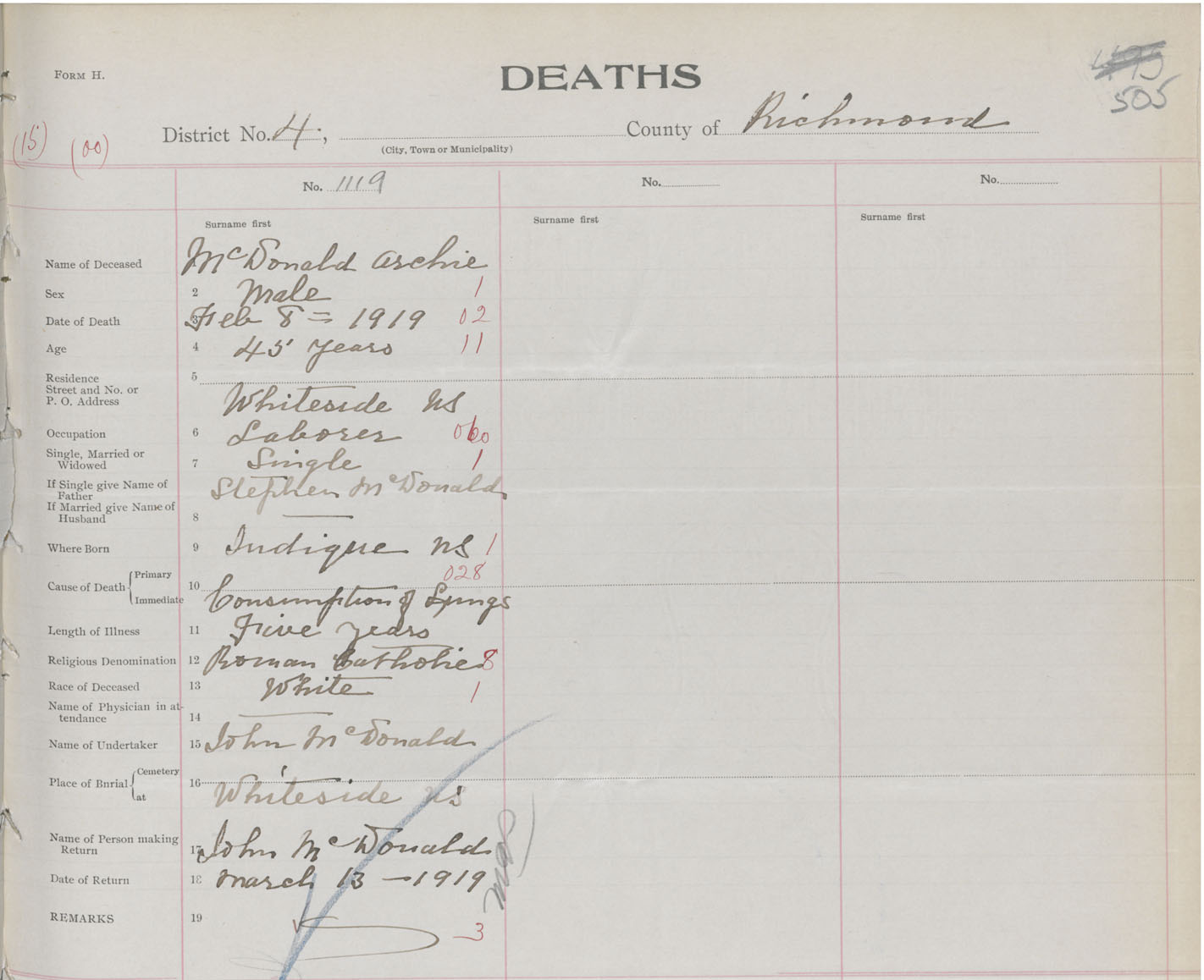 Male Death Registration: Year: 1918 book: 47 page: 505 number: 1119