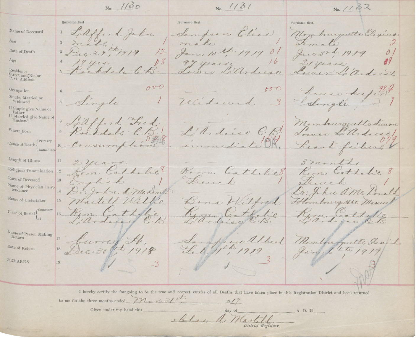 Male Death Registration: Year: 1919 book: 47 page: 511 number: 1130