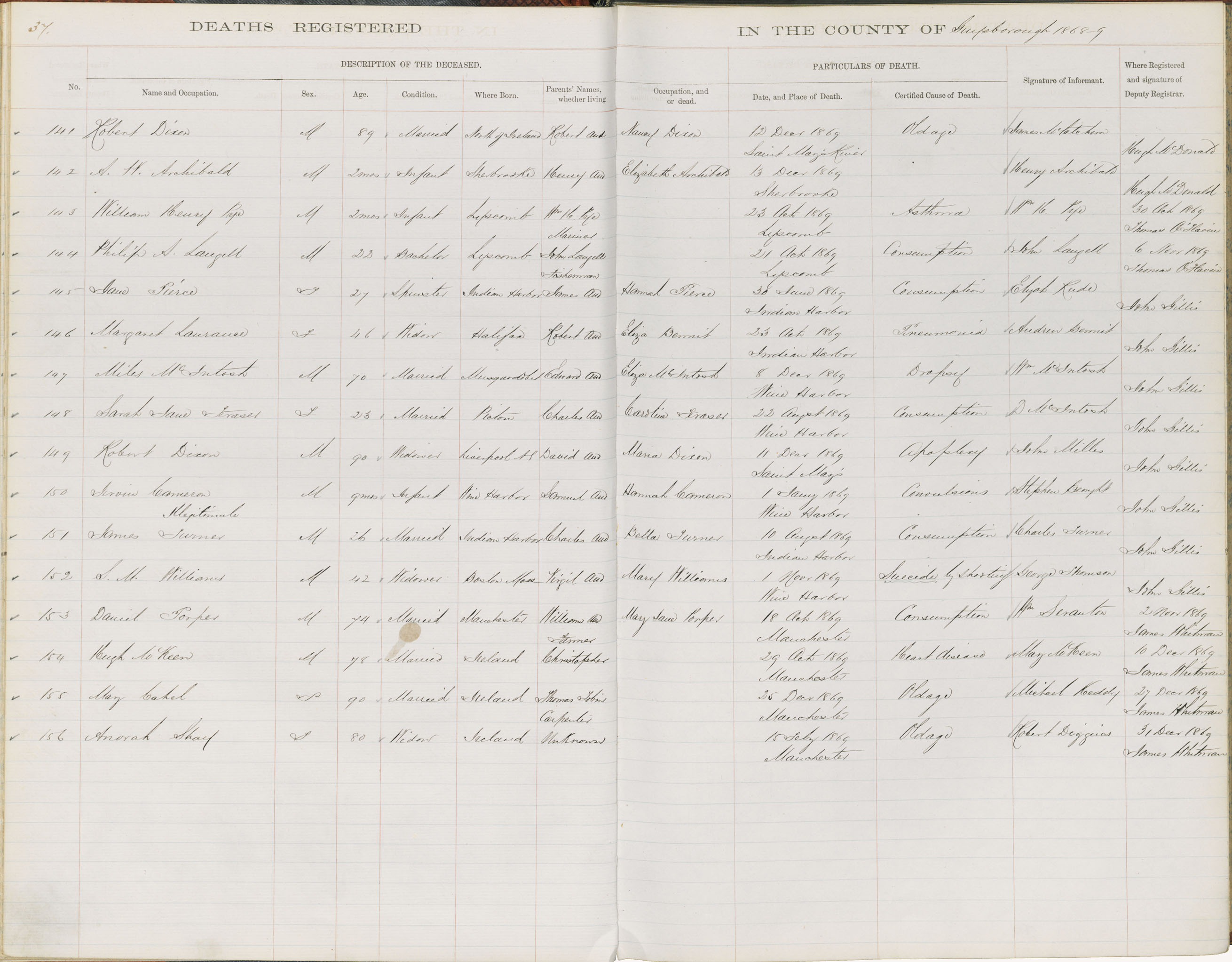 Female Death Registration: Year: 1869 book: 1807 page: 37 number: 156