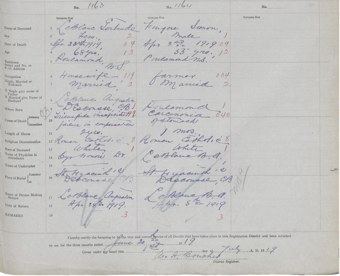 Male Death Registration: Year: 1919 book: 47 page: 523 number: 1164