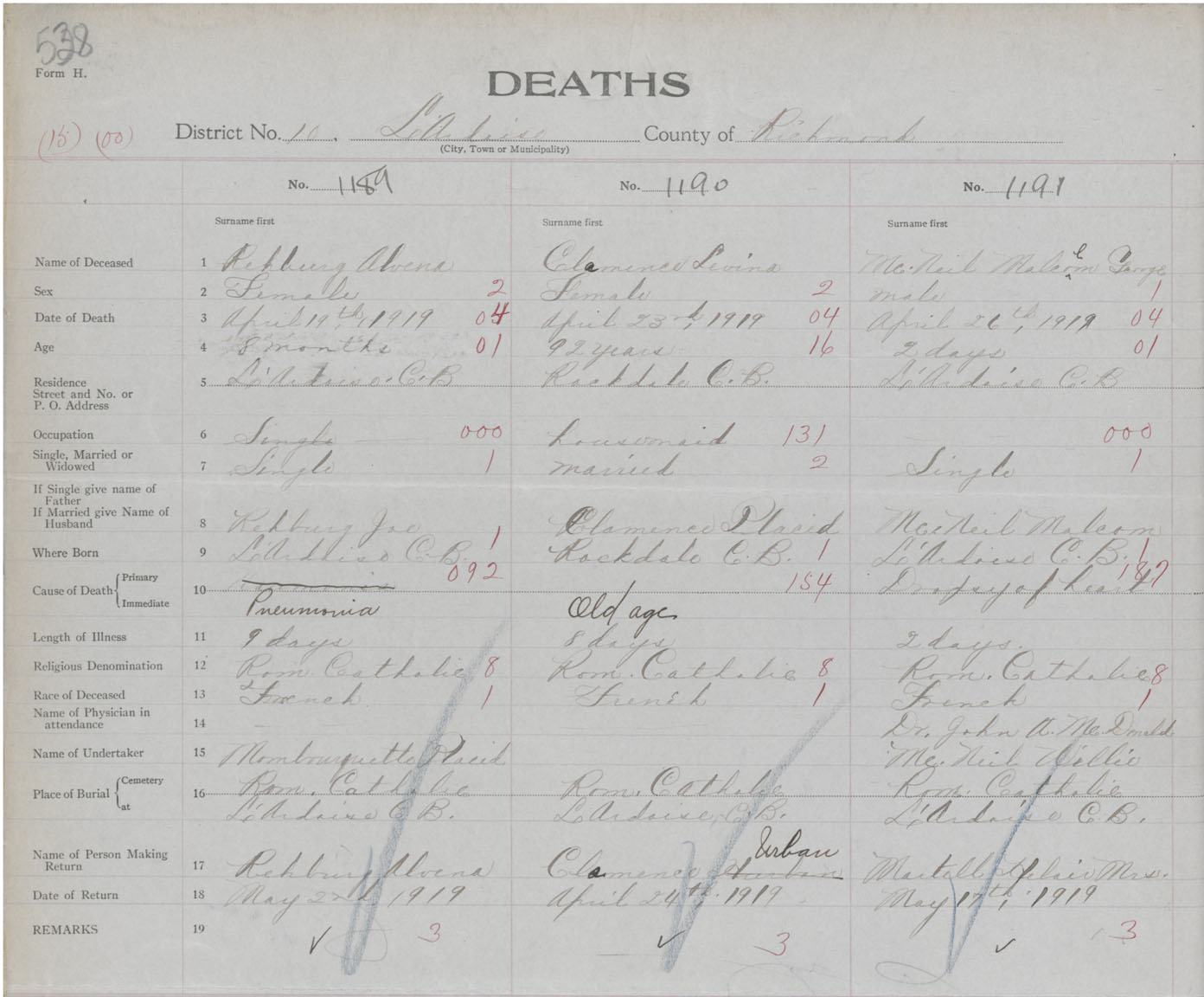 Male Death Registration: Year: 1919 book: 47 page: 538 number: 1191