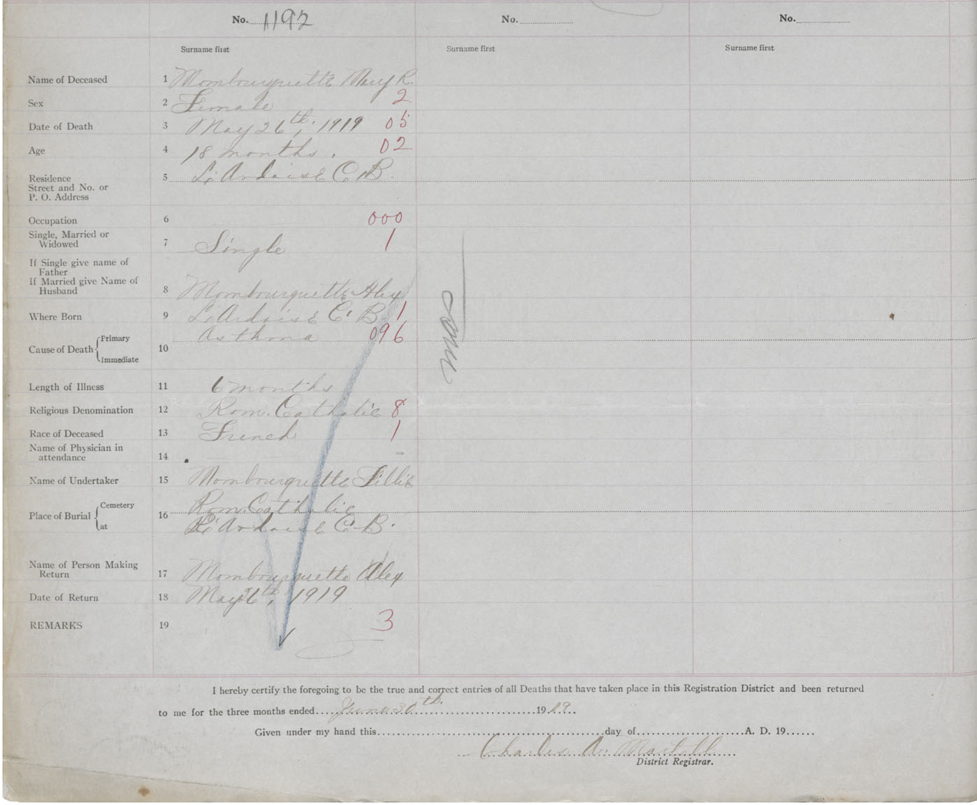 Female Death Registration: Year: 1919 book: 47 page: 538 number: 1192