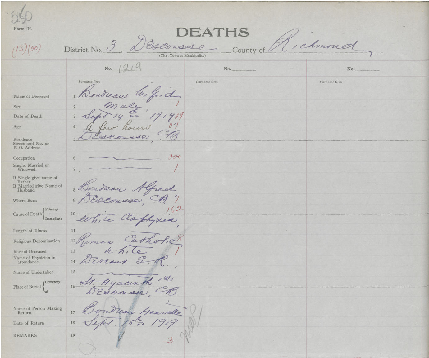 Male Death Registration: Year: 1919 book: 47 page: 550 number: 1219
