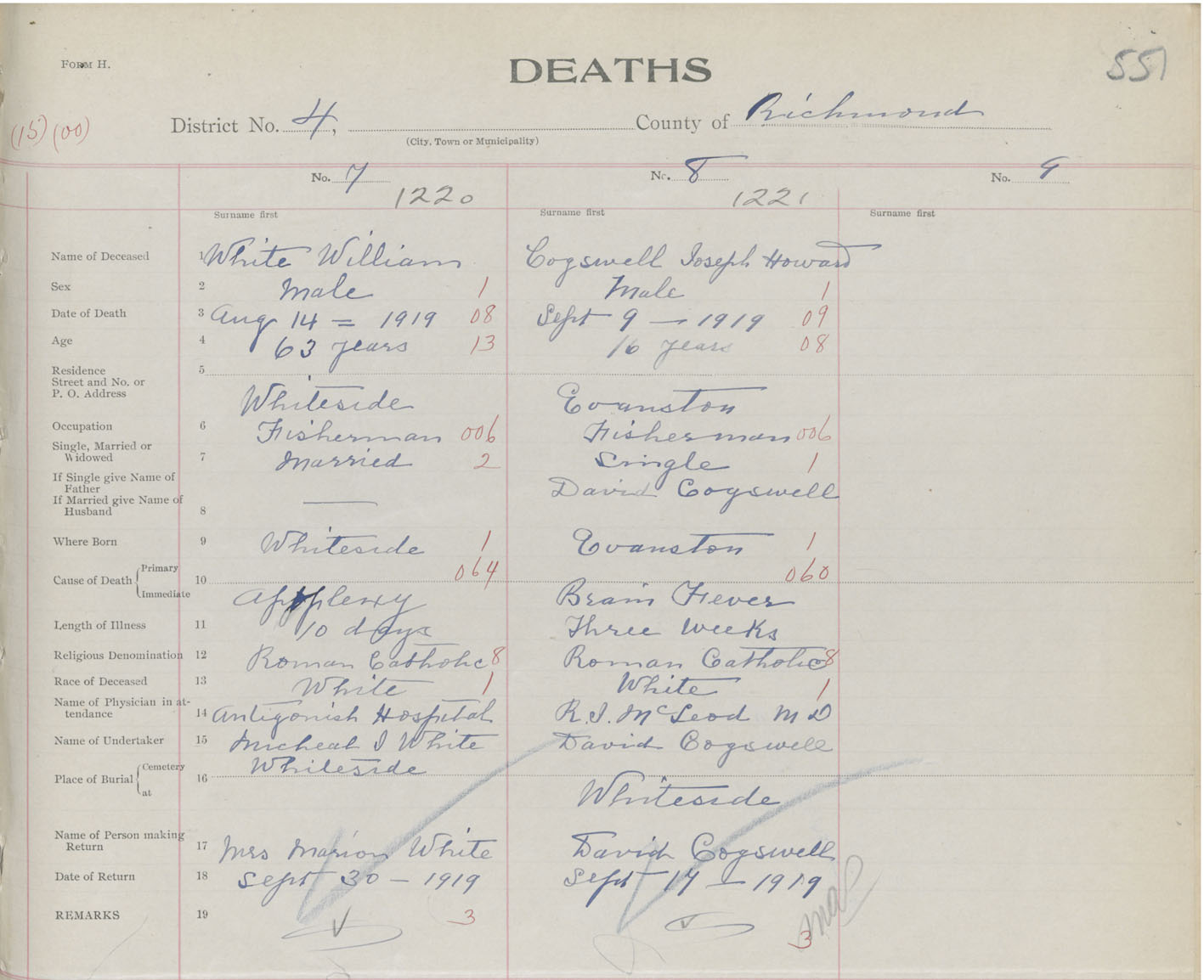 Male Death Registration: Year: 1919 book: 47 page: 551 number: 1221