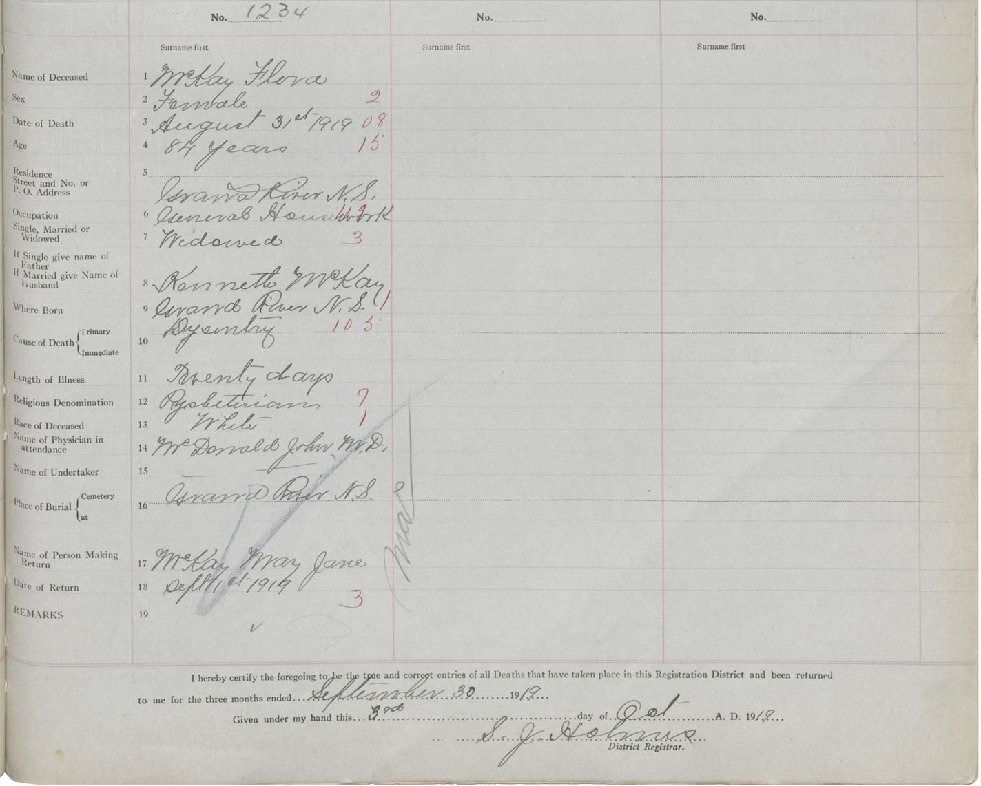 Female Death Registration: Year: 1919 book: 47 page: 557 number: 1234
